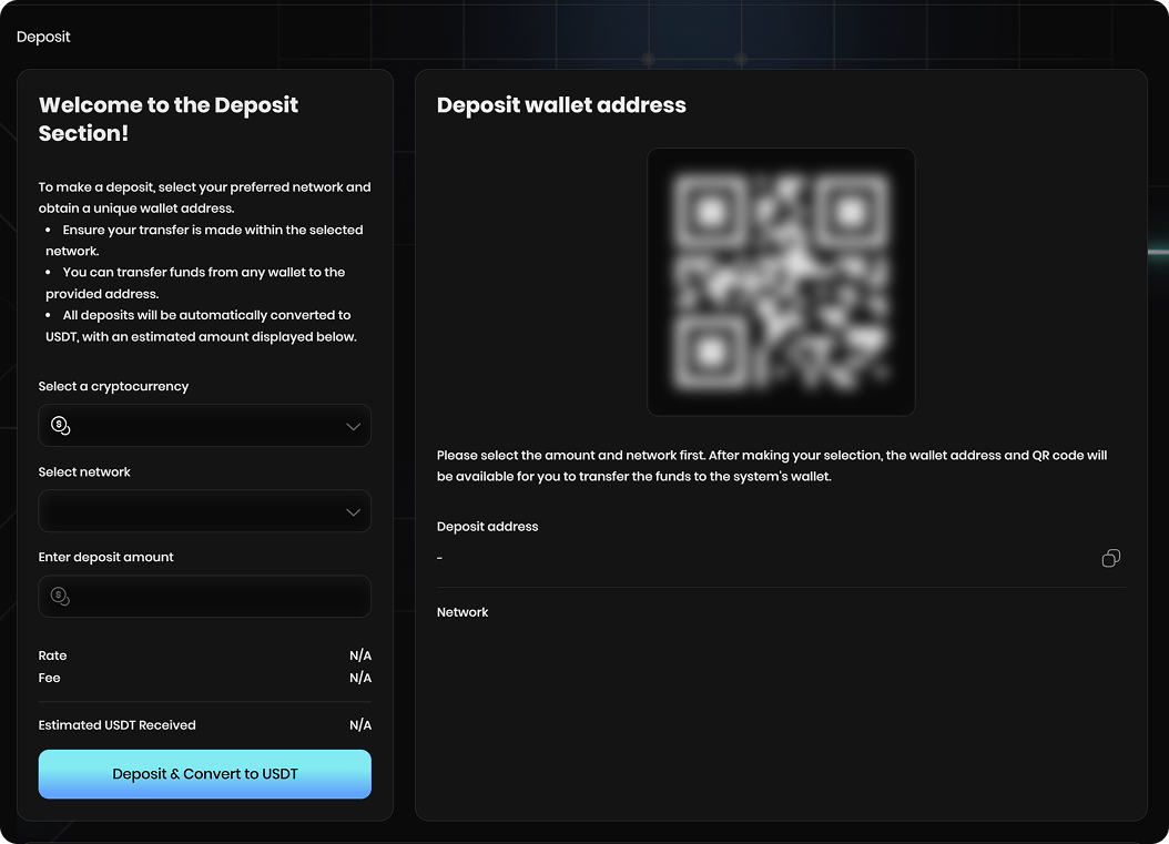 - After sending your funds, they are automatically converted to USDT for use in the platform.